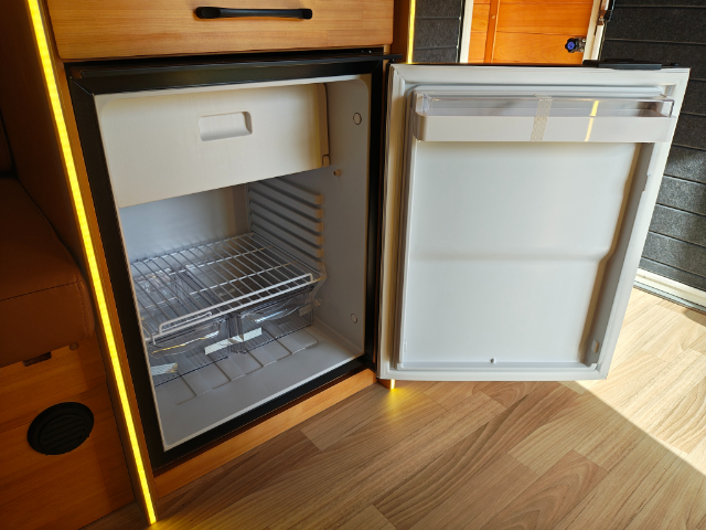 そして向かい側にも同じようなキッチンスペースがあり、一番下には85Lの冷蔵庫が設置されています。上部には冷凍庫もあります。