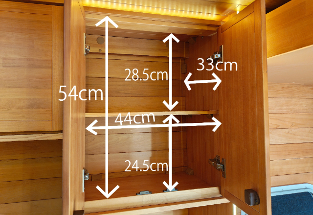 そしてその上の収納は、開口部は幅44cm×高さ54cm。真ん中に仕切り板があって、上下に収納スペースがあります。上段の高さが28.5cm、下段の高さが24.5cm。奥行きは33cmほどあります。
