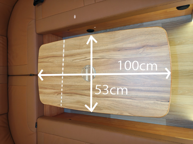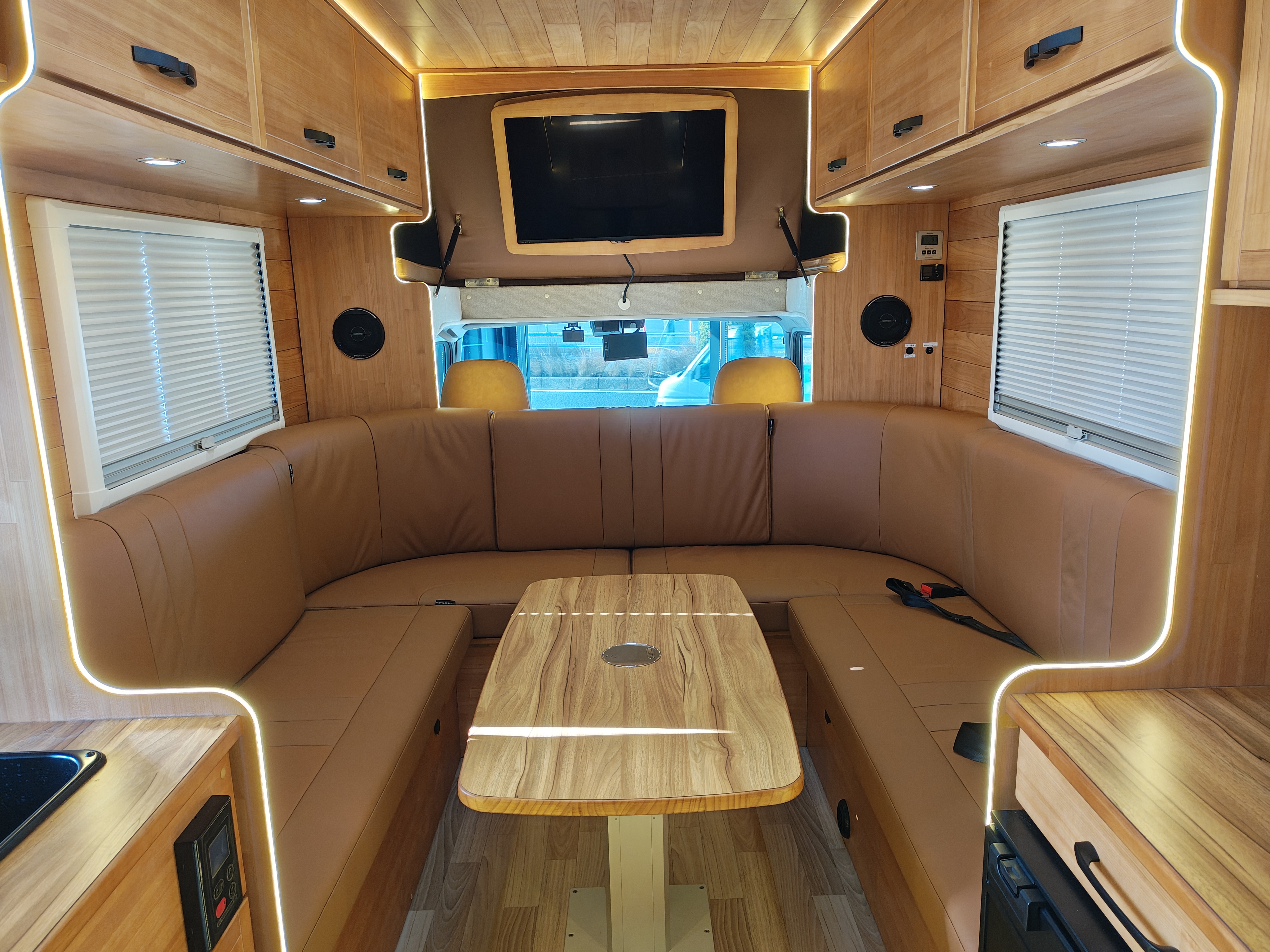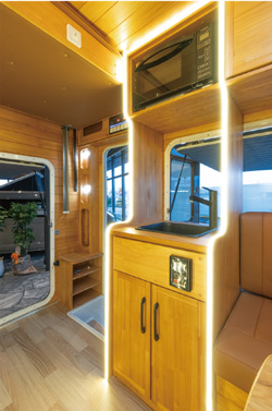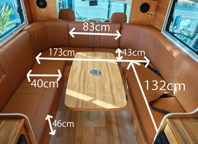 続いて、ダイネットを見ていきましょう。テーブルを囲んでコの字にソファーが配置されています。その名の通り、ログハウスの中にいるような落ち着いた雰囲気ですね!両サイドにはアクリル窓があり、外側に大きく開けることもでき、簡単に網戸やシェードにもできます。このソファーに5名分のシートベルトがあり、運転席、助手席2名と合わせて、8名乗車することができます。