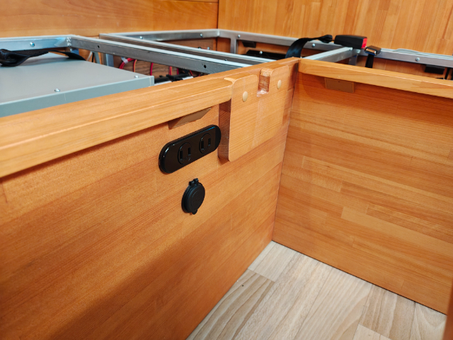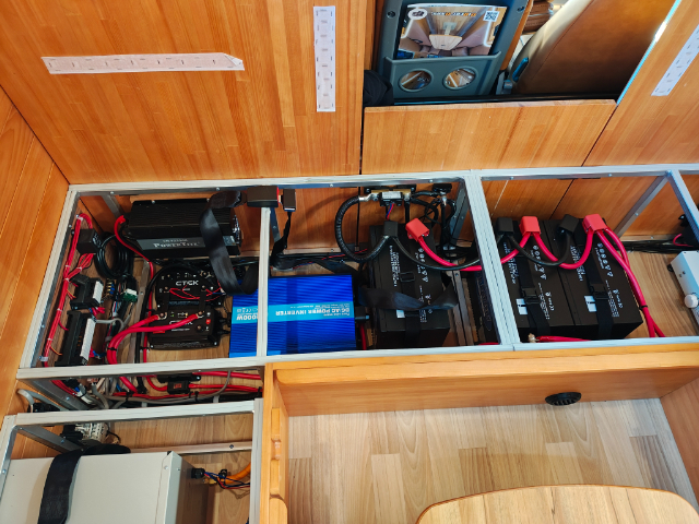 続いて、電装システムが装備されているダイネットのソファー下をご紹介します。リチウムイオンバッテリー150Ah×3個、2000Wインバーターが標準装備になっています。その他、充電システムも一か所にまとまっていて分かりやすいですね!