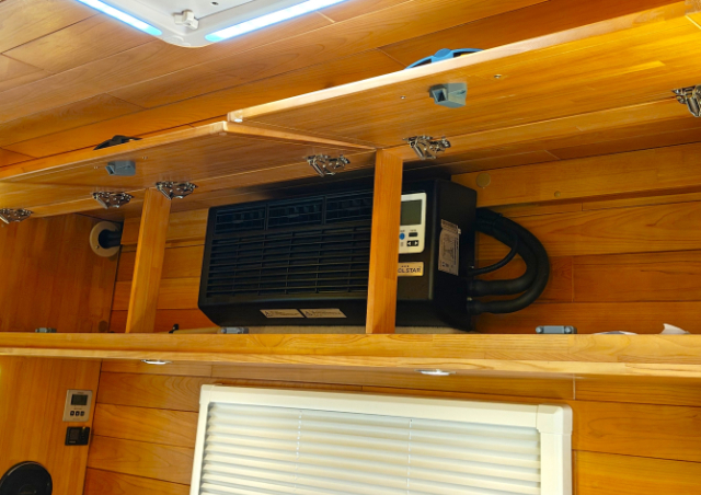 運転席側の収納棚中央にはDCクーラーが標準装備されています。使わない時は扉を閉めておけば目立ちません。DCクーラーがあれば、暑い夏の車中泊にも安心です。