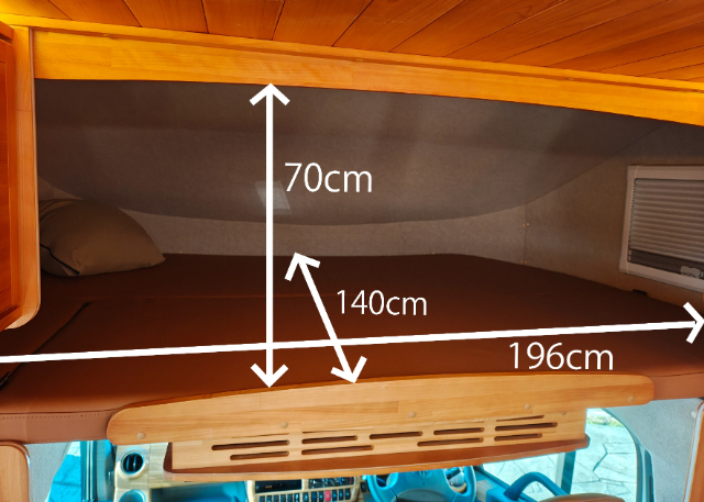 ベッドにする時は、跳ね上げ部分を降ろすだけで簡単です。バンクベッドのサイズは、最長のところで測ると、幅196cm×奥行き140cm×高さ70cmですが、奥に行く毎に狭くなっていきます。狭いところだと幅は175cm、一番奥の高さは14cmでした。これだけのスペースがあれば、二人ほど就寝できそうです。