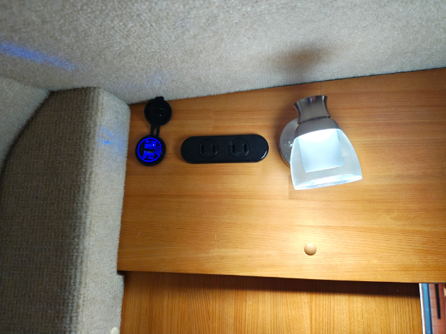 バンクベッドには、両サイドにアクリル窓、読書灯があり、運転席側にはコンセント(2口)、USBソケット(2口)もあります。