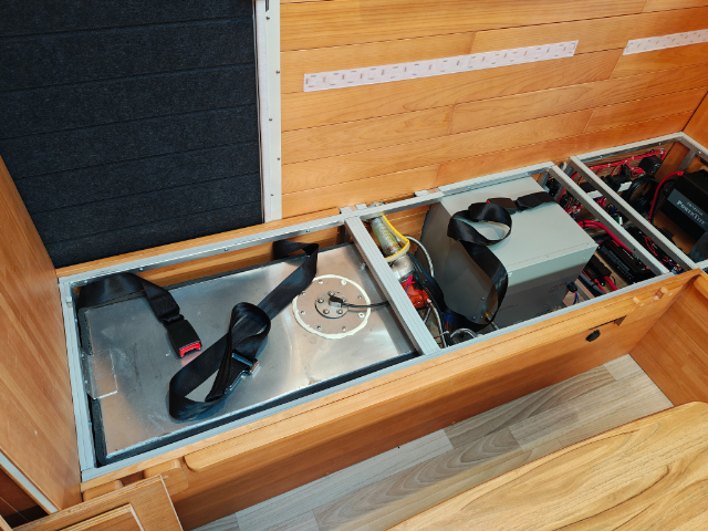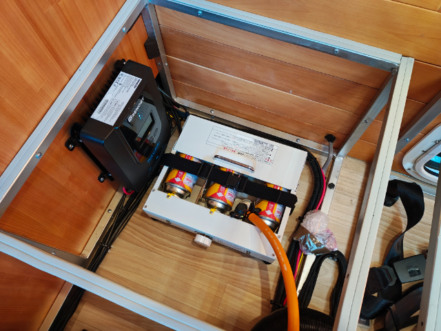 温水ボイラーの燃料は、運転席の後ろのシート下で取り替えることができます。カセットガスを3本セットすることができます。また、標準装備でソーラー355Wが付いていますので、そのソーラーシステムもここにあります。