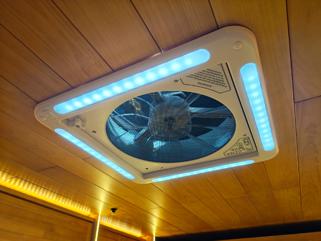 便利な装備といえば、ダイネットの真上には、LEDライトを搭載したシーリングファン(換気扇)があります。間接照明との組み合わせで、優しく室内を照らしてくれます。