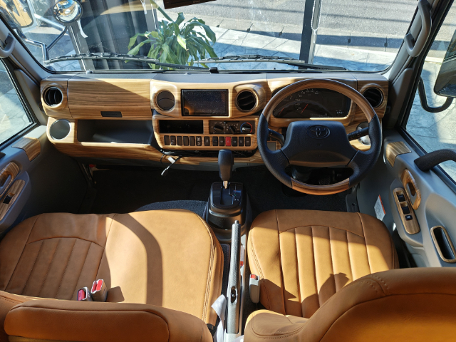 ここまで見て「LOGHOUSE」に魅了された方、実はオプションで運転席のフロント周りも木目調のウッドパネルで雰囲気を統一することができますよ!シートカバーやハンドルなども合わせると、ログハウスのコンセプトにピッタリですね!