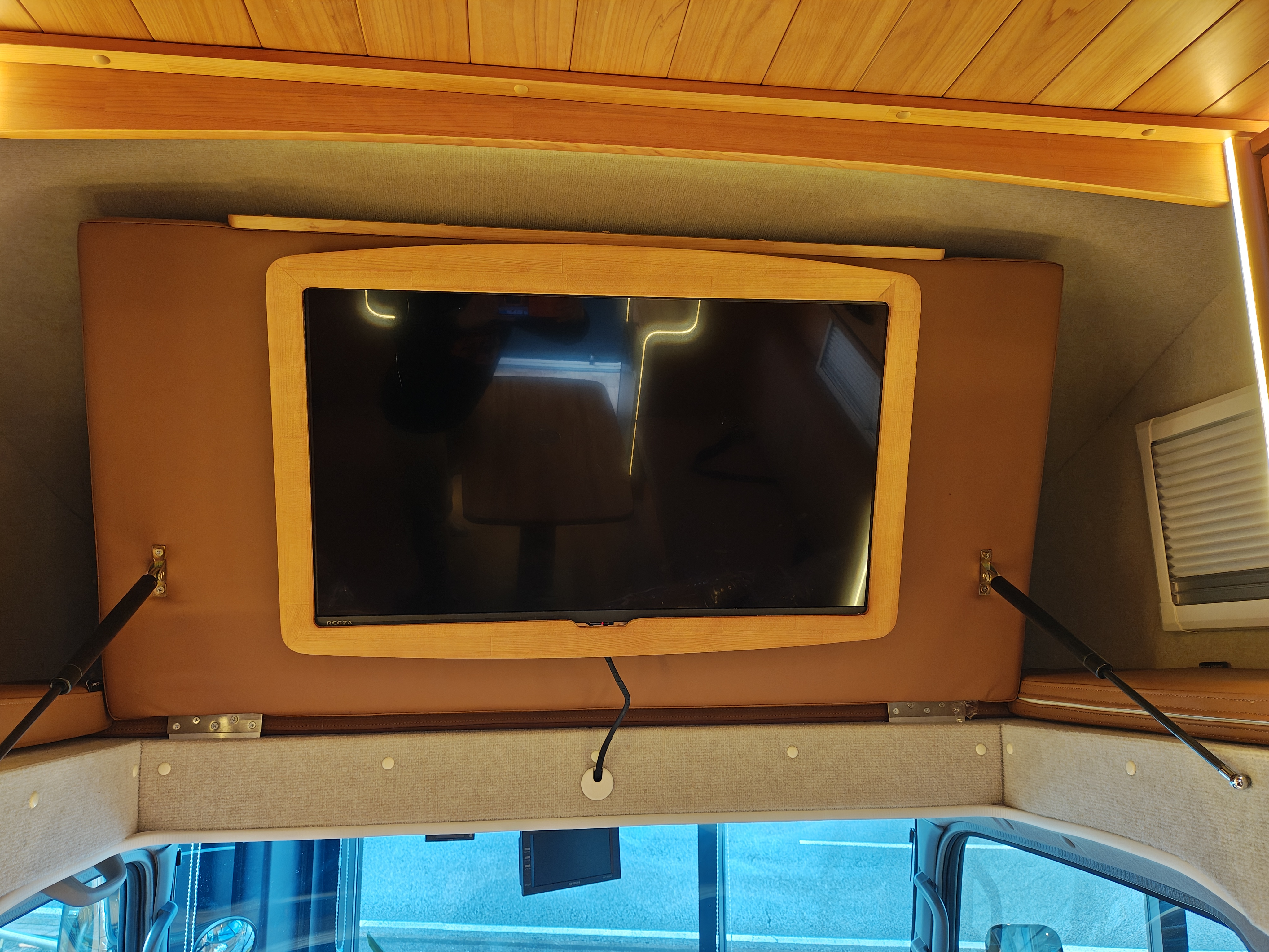 バンクベッドは大きく跳ね上げることができ、運転席からダイネットへ移動しやすい空間を作ることができます。またバンクベッドの跳ね上げ部分には、32インチの大型テレビが装備されています。なんと、こちらも標準装備です!
