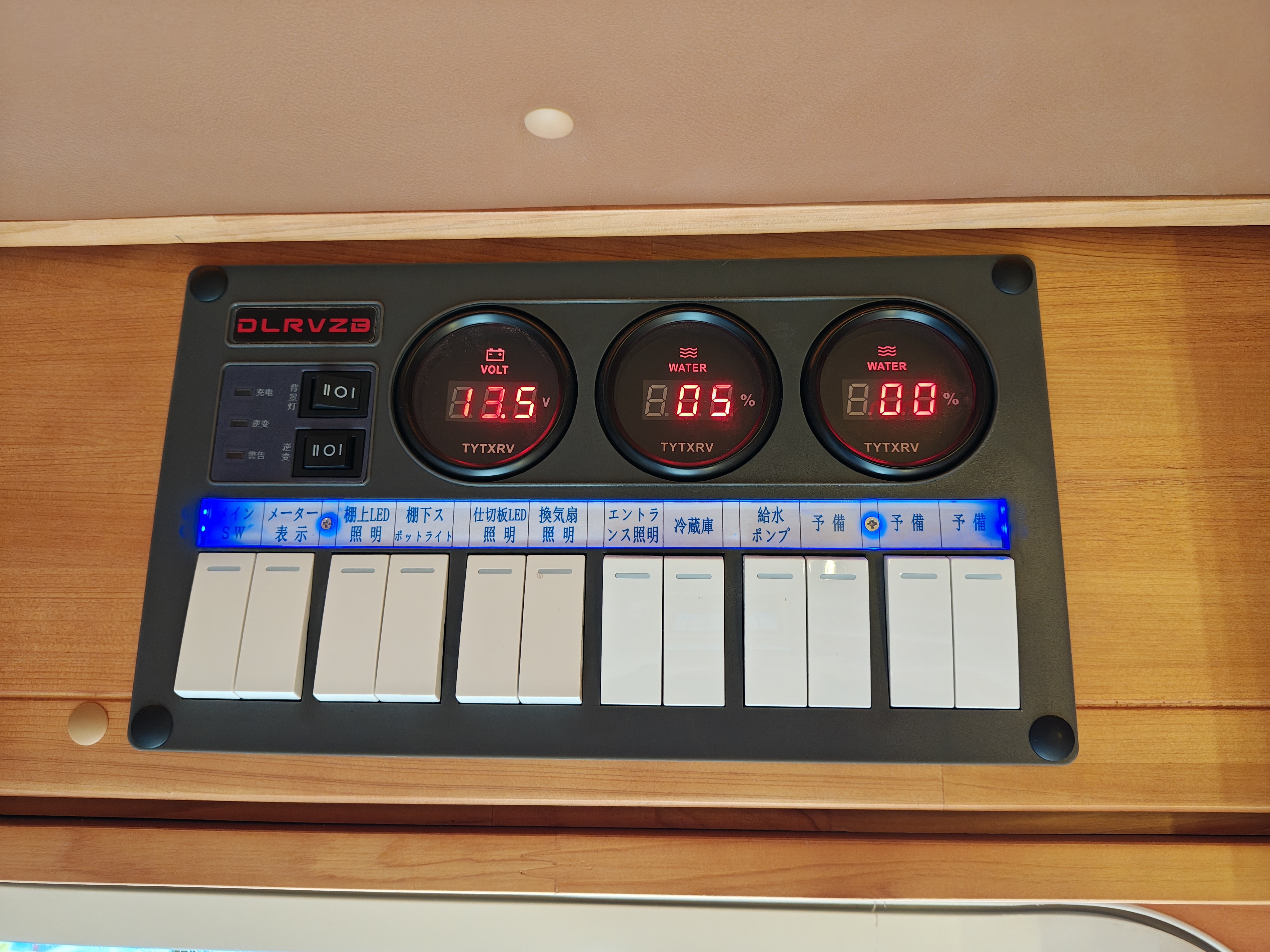 エントランスドアの上部には、車内の照明や冷蔵庫などのスイッチがまとまっているコントロールパネルがあります。一括で操作できるのは、使いやすく便利です。電圧計や給排水タンクの残量計も付いています。タンクの水量が一目でわかるのも助かりますね!