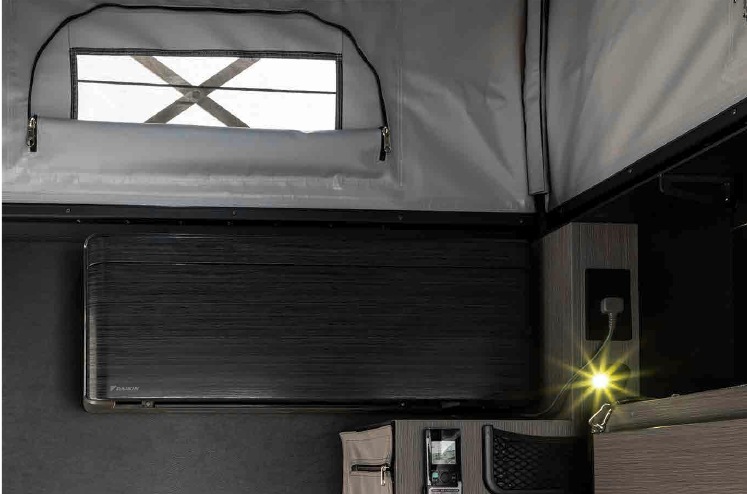 コンパクトなキャンピングトレーラーのサイズながら家庭用クーラーを設置。