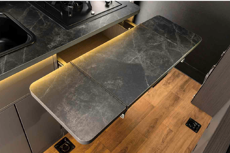 キャビン前面から引き出し式テーブルがスライドアウトする仕組み。